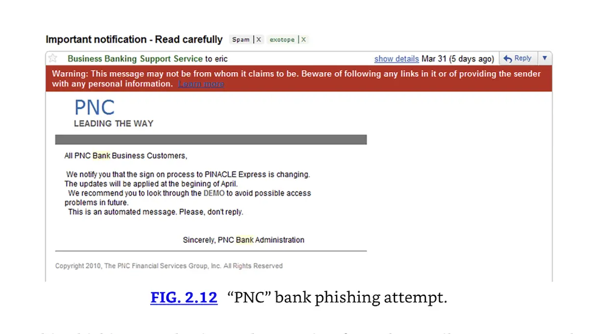 A phisher (“fisher” spelled with the hacker spelling of “ph” instead of “f”) is a malicious attacker who attempts to trick users into divulging account credentials or PII. Many phishers attempt to steal online banking information, as the phishing attack in Fig. 2.12 shows.