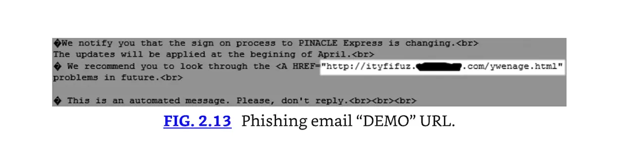 This phishing attack triggered a warning from the email system, correctly warning, “This message may not be from whom it claims to be.” The attack is attempting to trick the user into clicking on the “demo” link, which is a malicious link pointing to a domain in Costa Rica (with no connection to PNC Bank); the relevant email plain text is highlighted in Fig. 2.13.